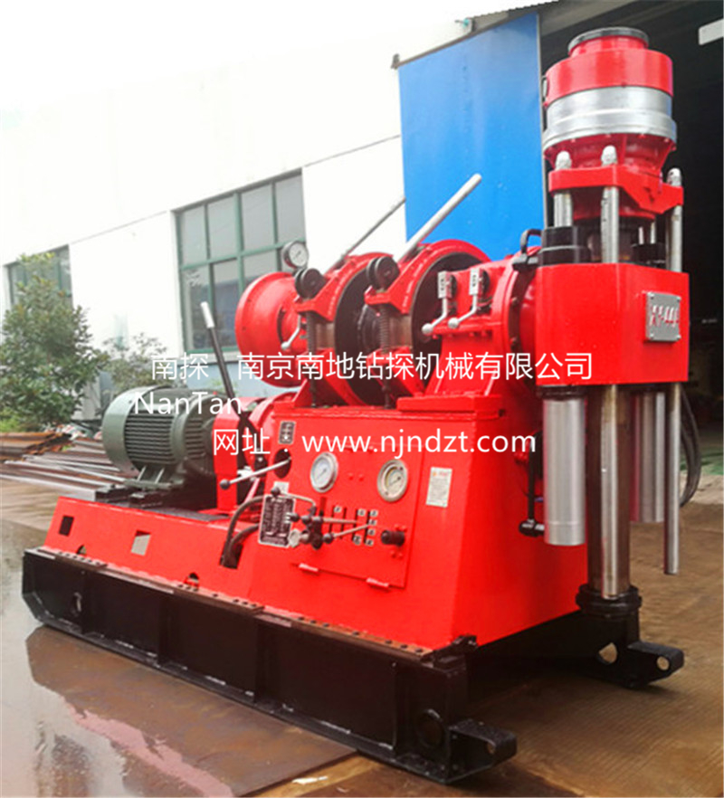 特點:具有較多的轉速級數(8級)和合理的轉速范圍,低速扭矩大(最大達3200牛頓·米),既適合以合金、金剛石巖心鉆進,也可用于工程地質勘察,水文水井鉆進和基礎樁工程施工。立軸通孔直徑大(直徑93毫米),雙軸缸液壓給進,行程較長(可達600毫米),工藝適應性強,特別適合大直徑鉆桿繩索取心(上部取心)鉆進,有利于提高鉆進效率和減少孔內事故。重量輕,可拆性好,鉆機凈重2300千克,主機可分解為10個部件(最大可拆部件重量300千克),搬遷方便,宜于山區工作。 液壓卡盤采用雙向供油并裝有液壓鎖,卡盤夾持力大,夾持穩定。 配有水剎車,深孔鉆進,下鉆平穩安全。采用單聯齒輪油泵供油,安裝簡單,方便使用,功率消耗少,液壓系統油溫低,工作穩定。系統中裝有手搖油泵,當動力機不能工作時仍可用手搖油泵起出孔內鉆具。 鉆機結構緊湊,布局合理,所有部件表露在外,不相互重迭,便于維護、保養和修理。重心低,移車距離長(可達460毫米),固定牢靠,高速鉆進穩定性好。 配有防震儀表,儀表壽命長,利于掌握孔內情況。操縱手把較少,操縱靈活可靠。通用化程度高,該機與XY-4型鉆機通用件達60%,與XY-42型鉆機通用件達75%。